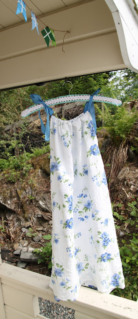 Dette er putetrekkjolen. I boken er kjolen laget av ett putetrekk, men siden jeg har laget den noe større enn den i boken, så har jeg brukt to putetrekk. Morsom og enkel å lage, og med putetrekk fra loppemarked til fem kroner stykket, og billig sløyfebånd fra Søstrene Grene, så ble dette en skikkelig lavbudsjettskjole. Og det kan vi like. Man har da annet å bruke feriepengene på:-)